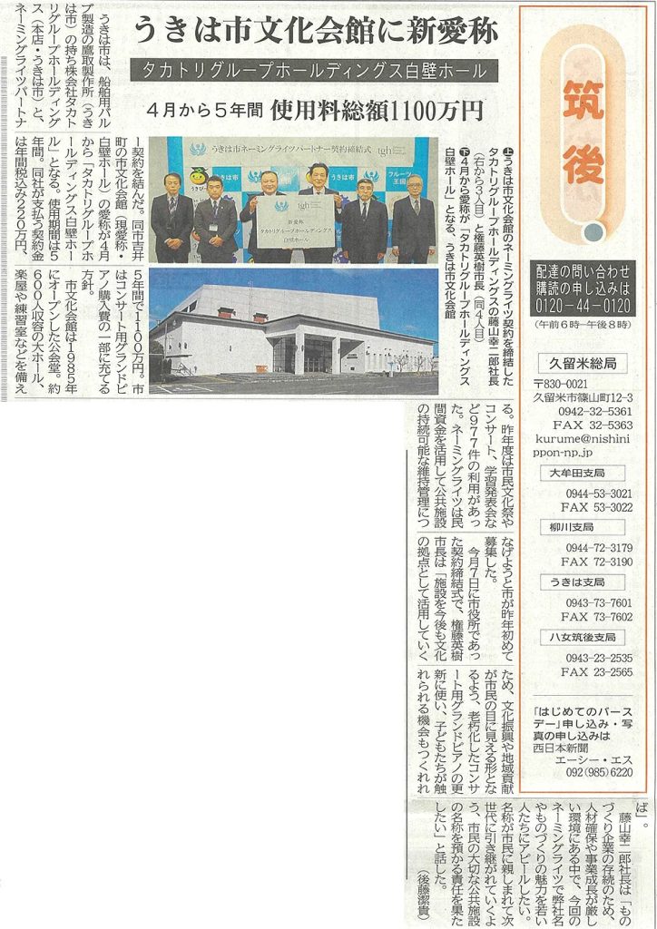 新聞掲載のお知らせ 「うきは市文化会館に新愛称『タカトリグループホールディングス白壁ホール』」